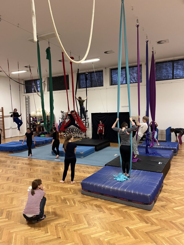 – ZÁVĚSNÁ AKROBACIE (jednoduché prvky na visuté hrazdě, příp. úvod do cvičení na šálách)
